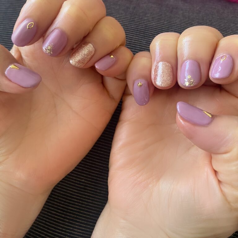 落ち着いたくすみカラーのパープルとゴールドのネイル♪